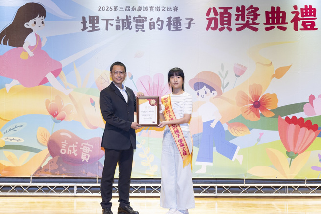 第三屆永慶誠實徵文比賽臺北市國中組第一名許睿恩(圖右) 。圖/永慶慈善基金會。
