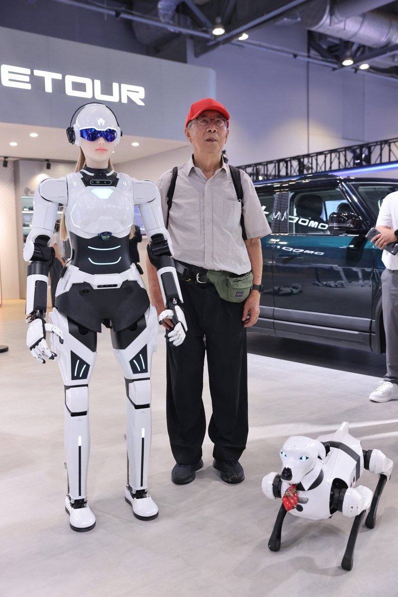 香港人力資源管理學會調查發現,73%受訪企業允許員工在工作中使用AI。圖爲日前國際汽車及供應鏈博覽會上,市民和機器人、機器狗拍照。(中通社)